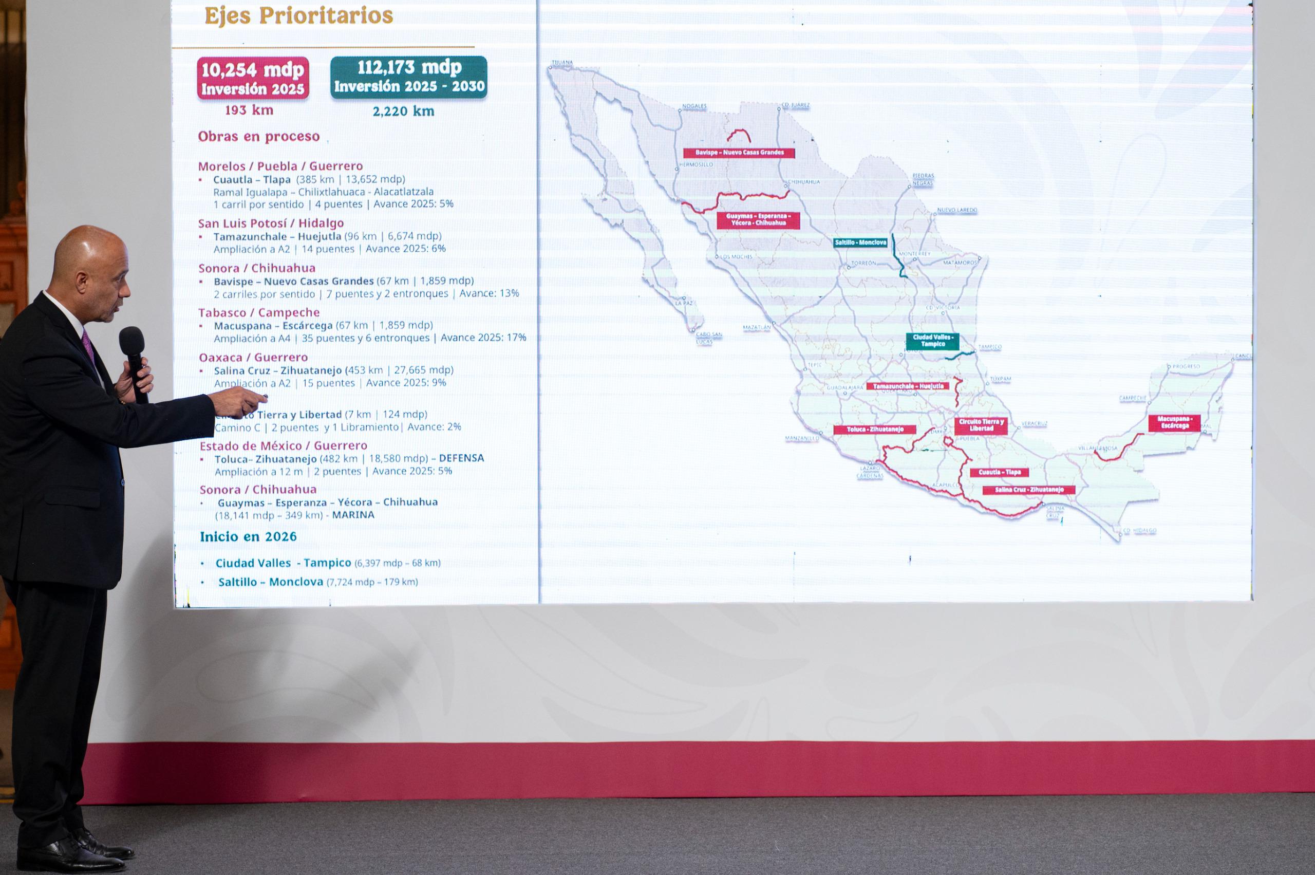 Ya se encuentran en proceso ejes prioritarios clave como Cuautla-Tlapa (5% de avance), Tamazunchale-Huejutla (6%) y Bavispe-Nuevos Casas Grandes (23%).