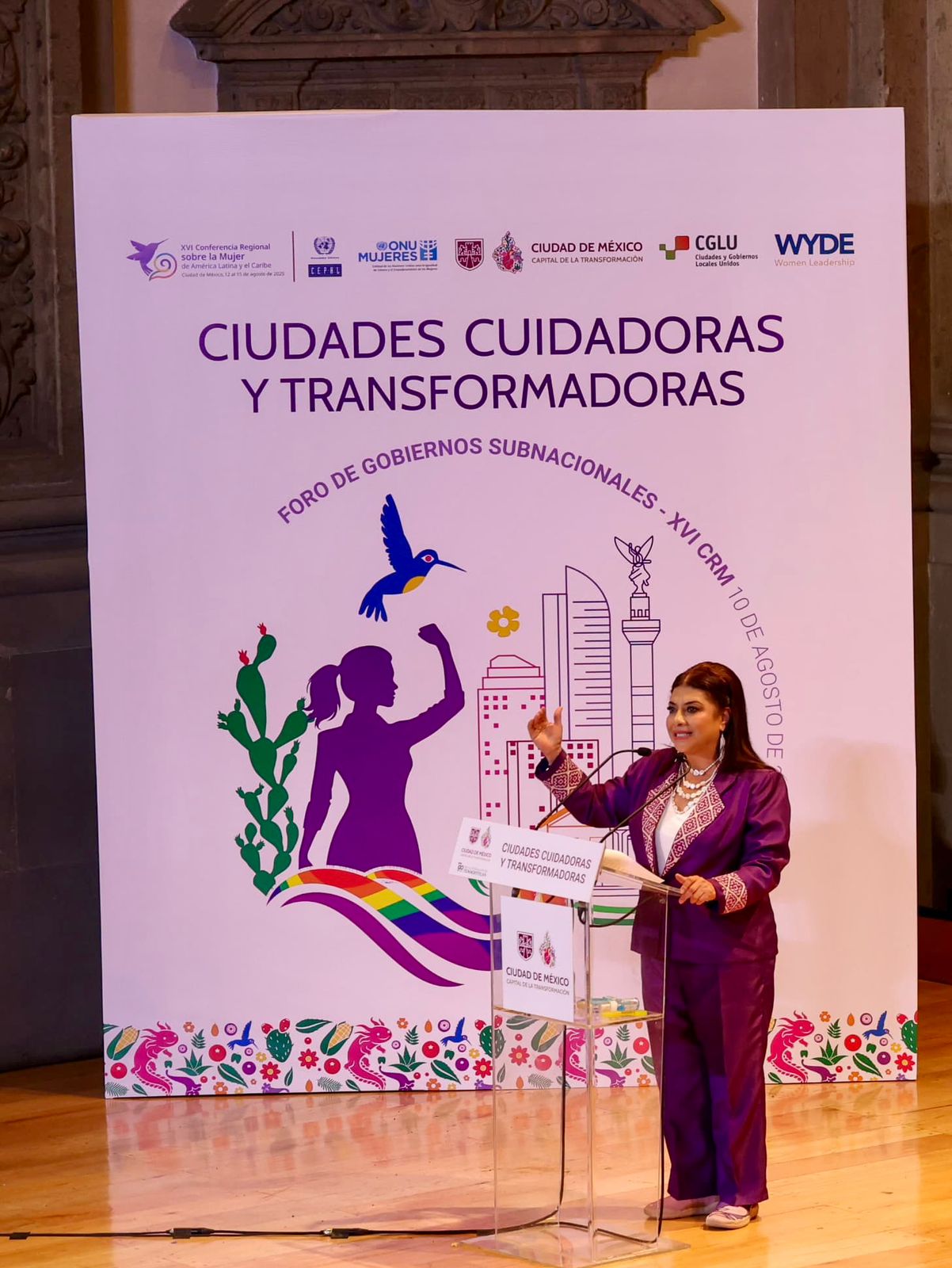 En el anfiteatro Simón Bolívar del Antiguo Colegio de San Ildefonso, la mandataria capitalina refirió que las ciudades son los lugares donde se gestan las transformaciones, desde abajo y en el territorio, en este caso para impulsar los cuidados como un derecho efectivo y colectivo.