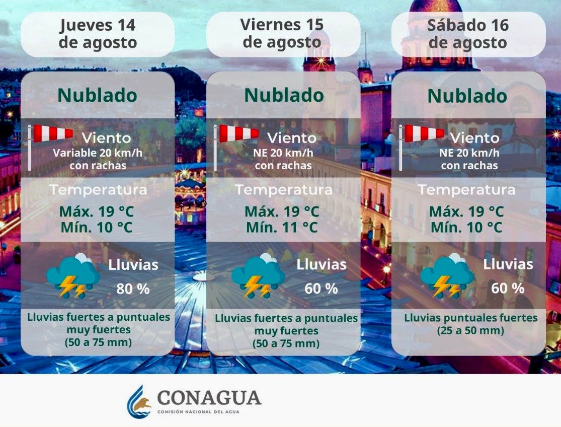 El consenso entre el SMN y la Comisión Nacional del Agua (Conagua) es que el jueves 14 de agosto será la jornada más crítica de la semana. Las precipitaciones, catalogadas como «muy fuertes», podrían estar acompañadas de tormentas eléctricas y caída de granizo, lo que incrementa el riesgo de encharcamientos severos e inundaciones repentinas en ambas entidades.