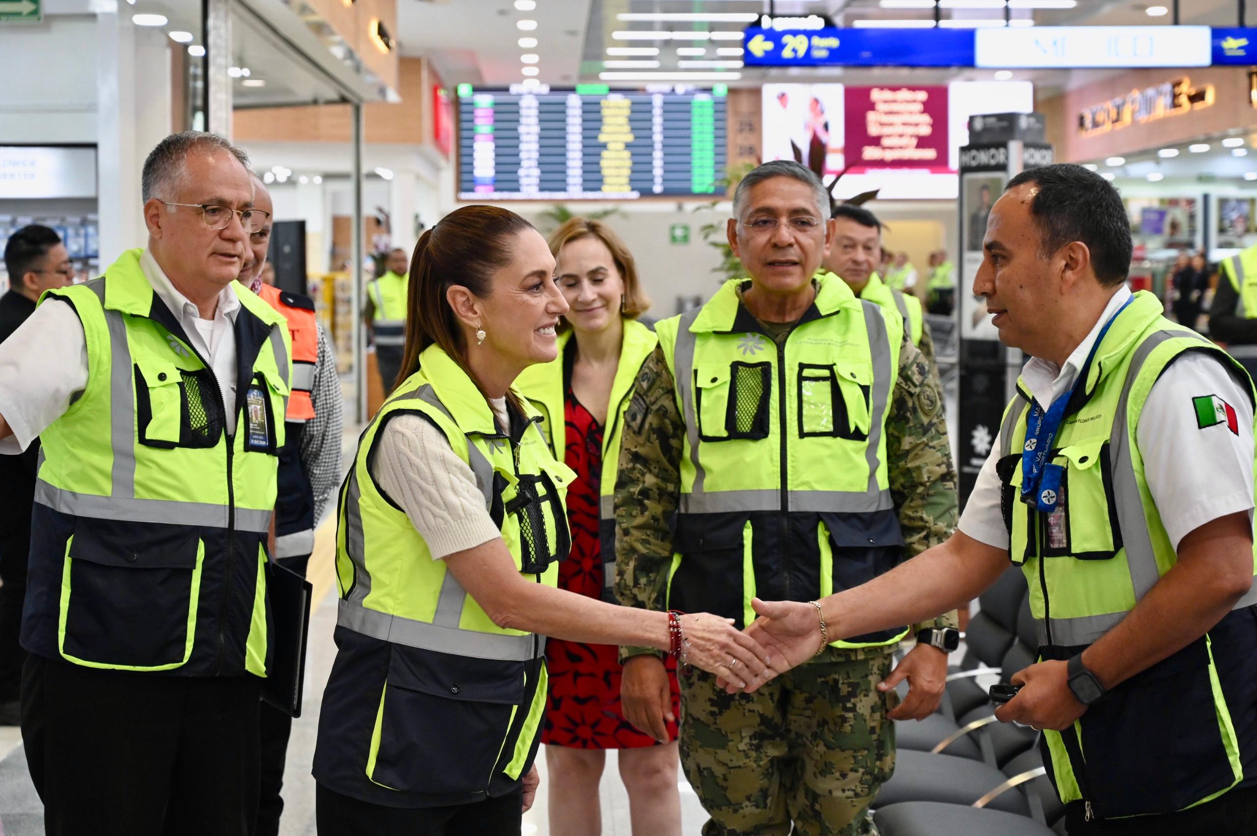 Acompañada por el Almirante Secretario de Marina, Raymundo Pedro Morales Ángeles, y el Secretario de Infraestructura, Jesús Antonio Esteva Medina, la Presidenta Claudia Sheinbaum cortó el listón de un área de 6,400 metros cuadrados completamente renovada. La zona intervenida incluye la sala de última espera para vuelos internacionales de las puertas 29 a la 36, pasillos de acceso y el vestíbulo de autobuses que transportan a pasajeros a posiciones remotas.