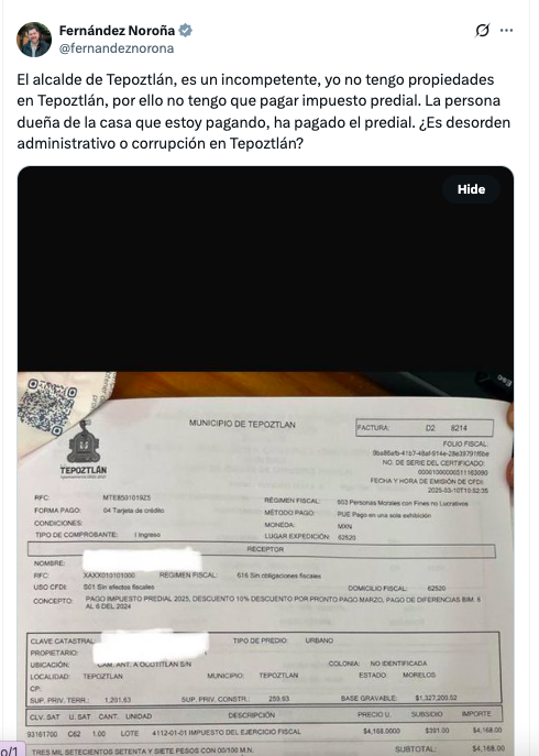 Según el senador, como está pagando la casa a través de un crédito, la obligación fiscal recae todavía en la persona que se la vendió. Para respaldar su dicho, compartió la imagen de un recibo por 3,777 pesos, asegurando que la dueña anterior ya había cubierto el pago de 2025. Acto seguido, cuestionó: «¿Es desorden administrativo o corrupción en Tepoztlán?».