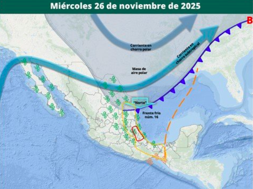 Si pensabas guardar la ropa de invierno, piénsalo dos veces. El Gobierno de México, a través de la Comisión Nacional del Agua (Conagua) y la Coordinación Nacional de Protección Civil (CNPC), emitió una alerta preventiva ante el reforzamiento del Frente Frío Número 16, el cual interactuará con una potente masa de aire polar y canales de baja presión, generando condiciones severas en gran parte del territorio nacional a partir de este miércoles 26 de noviembre.