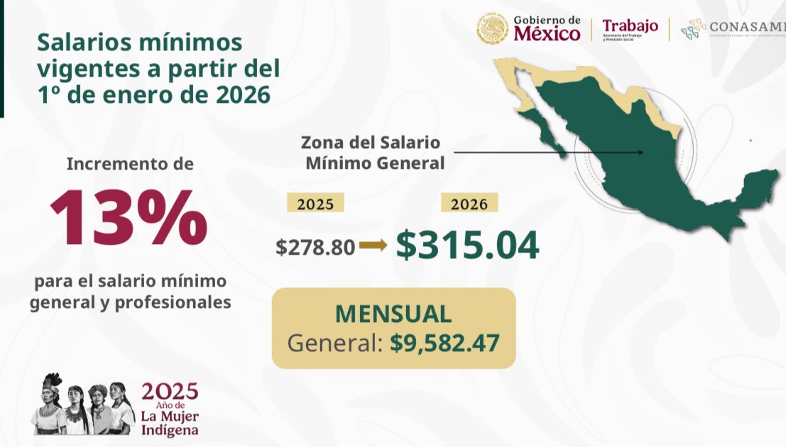 La presidenta Claudia Sheinbaum Pardo anunció que, a partir del 1 de enero de 2026, el salario mínimo general tendrá un aumento del 13%, pasando de 278.80 a 315.04 pesos diarios. Esto se traduce en un ingreso mensual estimado de 9,582.47 pesos, cifra que, según las proyecciones oficiales, permitirá adquirir el equivalente a dos canastas básicas.