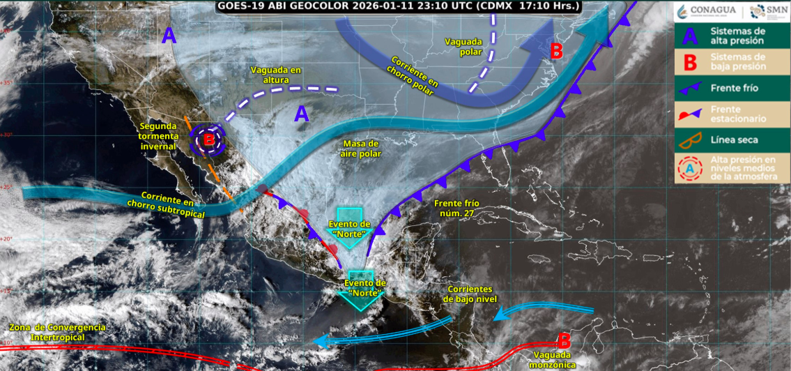 El regreso a clases de millones de estudiantes de educación básica, programado para este lunes 12 de enero, estará marcado por condiciones meteorológicas extremas. Mientras el Frente Frío número 27 y la Segunda Tormenta Invernal congelan el norte del país con pronósticos de nevadas y lluvia engelante, el sur y sureste se preparan para lluvias torrenciales que podrían superar los 250 milímetros.