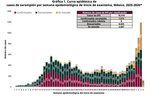Mientras el Gobierno Federal asegura que los casos activos de sarampión tienden a disminuir, las cifras oficiales revelan la magnitud del brote que atraviesa el país. Según el último Informe Diario de Sarampión, con corte a este martes, México acumula 7,674 casos confirmados entre 2025 y lo que va de 2026 , además de 26 defunciones asociadas a la enfermedad.