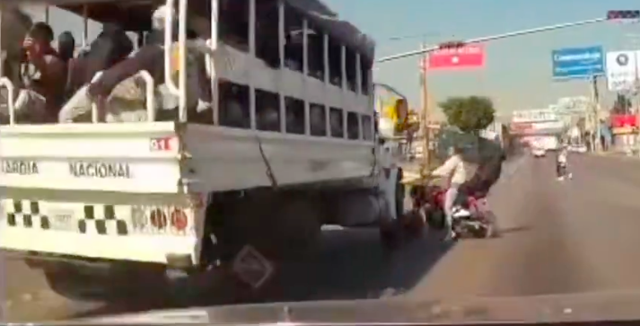 Imágenes captadas por un automovilista muestran la secuencia: el camión de la Guardia Nacional (número económico 303477) circulaba sobre el carril exclusivo del transporte público. Al llegar a un cruce, la unidad de las fuerzas armadas ignoró la luz roja del semáforo.