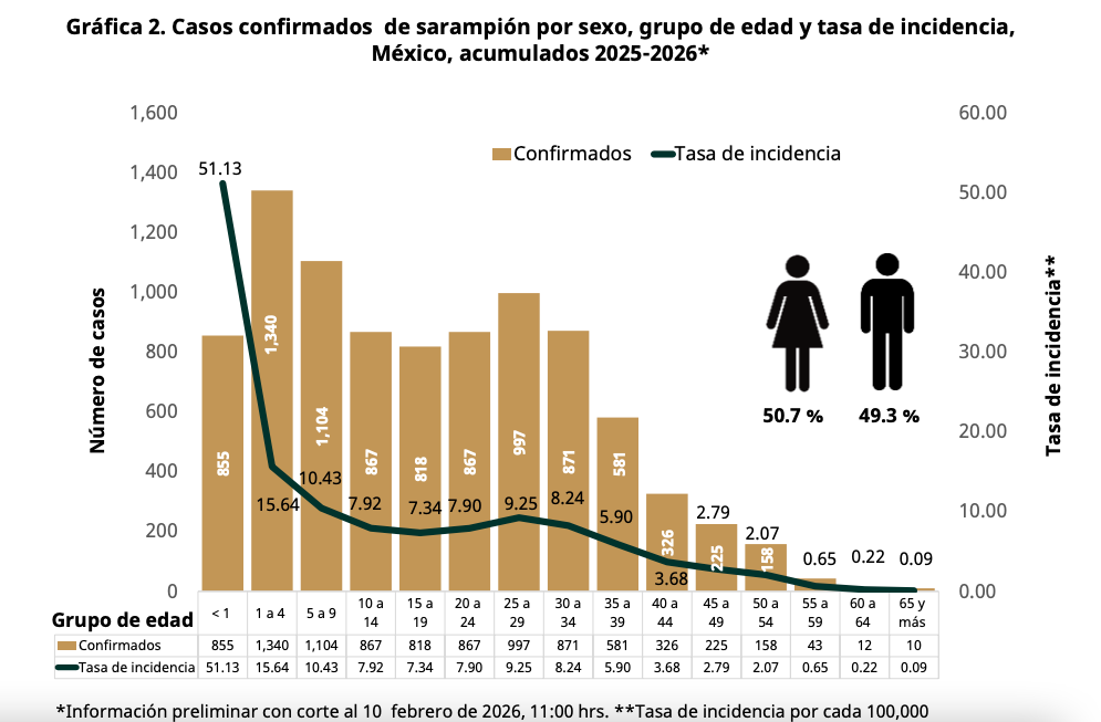 Población vulnerable y estrategia de vacunación Los datos técnicos revelan que el sarampión está afectando gravemente a la infancia. La tasa de incidencia más elevada se encuentra en los menores de un año, con 51.13 casos por cada 100,000 habitantes , seguido por el grupo de 1 a 4 años, que concentra el mayor número absoluto de enfermos con 1,340 casos.