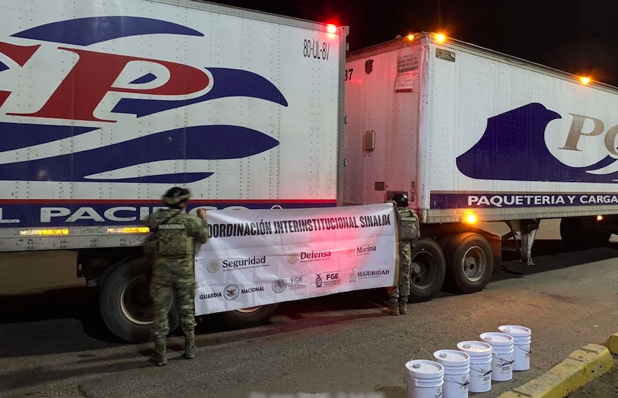Fotografía: rina decomisa 100 litros de tolueno en Topolobampo; SUMARIO: Elementos navales interceptaron un tractocamión de paquetería que transportaba este solvente industrial, altamente cotizado para la fabricación de drogas sintéticas.