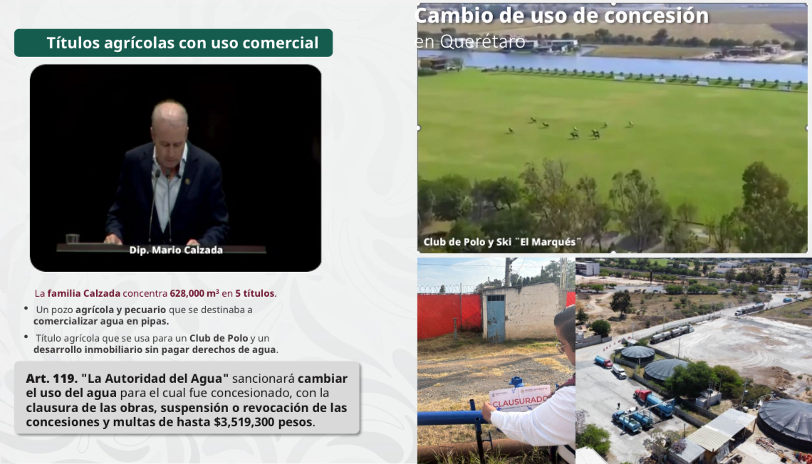 Según los datos oficiales, la familia Calzada concentraba 628,000 $m^{3}$ de agua en 5 títulos de concesión en el estado de Querétaro. Uno de estos pozos, con uso agrícola y pecuario, se utilizaba en realidad para comercializar agua en pipas. Otro título agrícola fue desviado para regar las vastas áreas verdes de un exclusivo Club de Polo y Ski «El Marqués», así como para abastecer desarrollos inmobiliarios privados, evadiendo el pago de impuestos. Ambos aprovechamientos ya fueron clausurados por la autoridad.