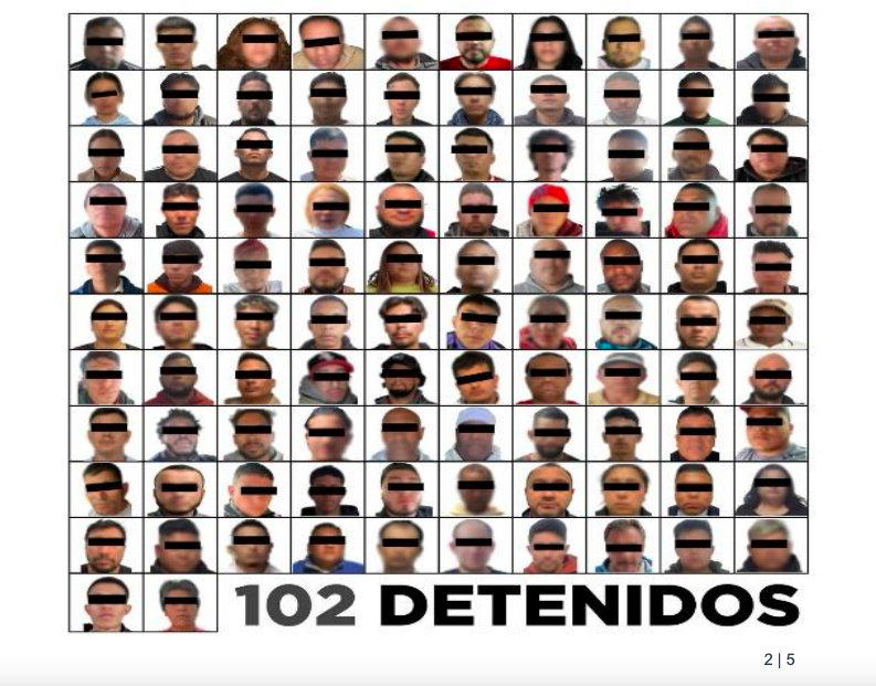 De los 102 detenidos en flagrancia y por órdenes de aprehensión, 77 son de nacionalidad extranjera y 25 son mexicanos. Hasta el momento, 50 de ellos (20 colombianos, 22 mexicanos, 6 venezolanos y 2 cubanos) ya han sido vinculados a proceso con prisión preventiva justificada. El Instituto Nacional de Migración (INM) se encuentra interviniendo para determinar la situación legal del resto de los extranjeros en el país.