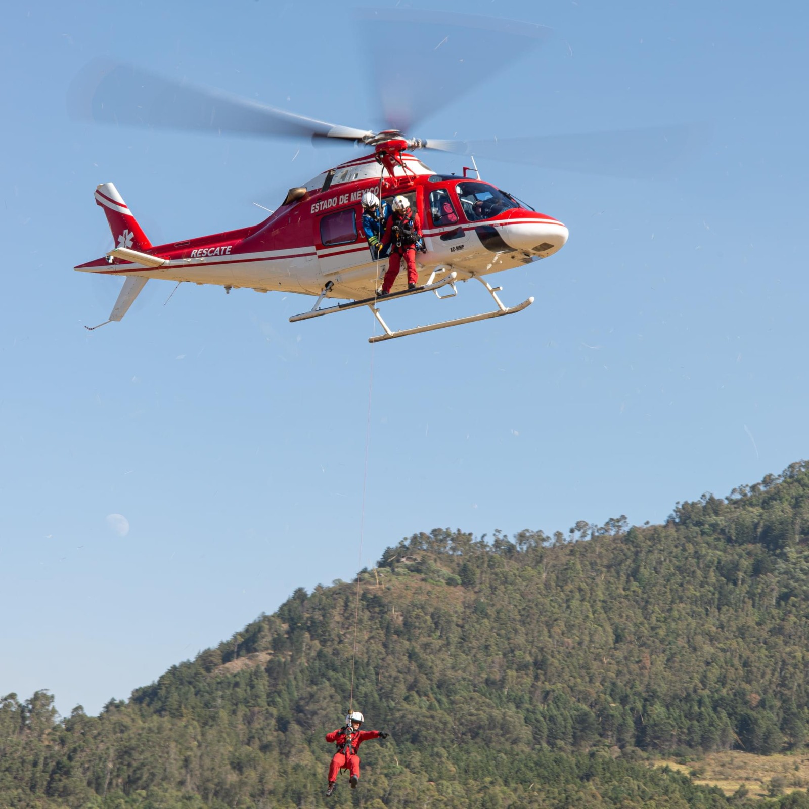 Una vez en el aire, la tripulación conformada por un piloto y un paramédico no solo coordina las descargas, sino que funge como un monitor de seguridad. Jorge Luis Marcial Gaona, paramédico de vuelo, señaló que la unidad cuenta con equipo biomédico preparado para hidratar y atender cualquier eventualidad médica del equipo.