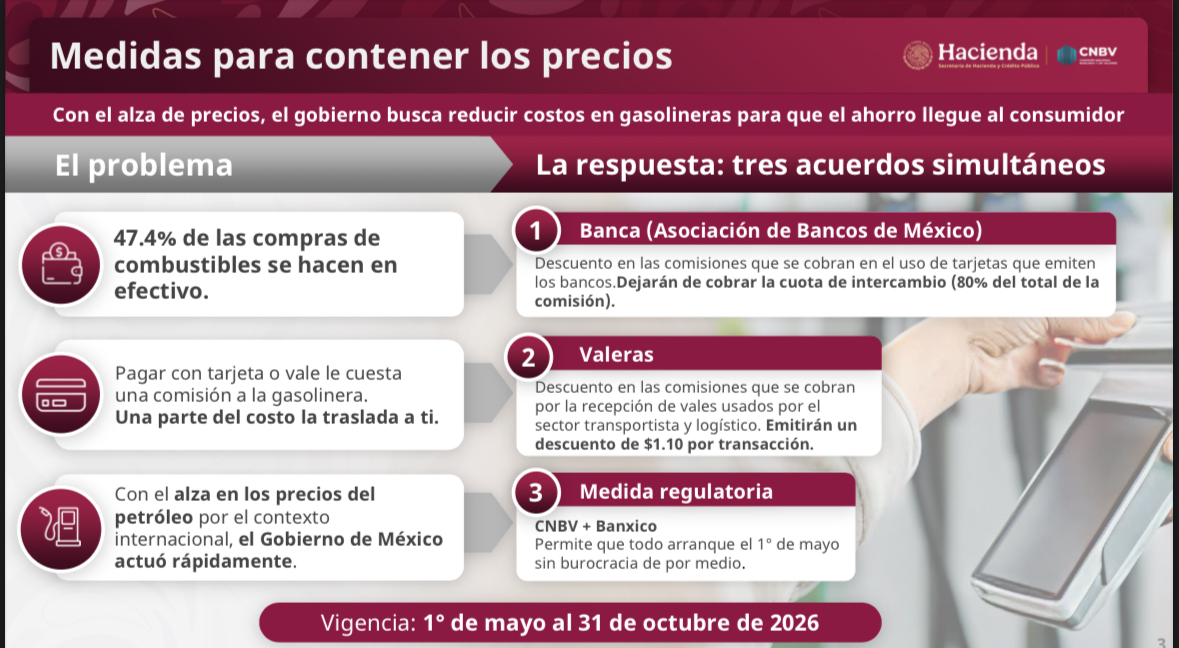 La medida, anunciada este lunes 27 de a bril por la presidenta Claudia Sheinbaum, entrará en vigor de manera automática —sin burocracia de por medio gracias a la regulación de la CNBV y Banxico— del 1 de mayo al 31 de octubre de 2026. Su lógica operativa es directa: al eximir a las estaciones de servicio de la «cuota de intercambio», el establecimiento reduce drásticamente sus costos operativos, abriendo la puerta para que ese margen se traduzca en litros más baratos para los automovilistas.
